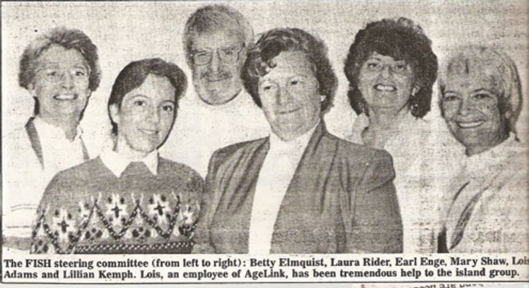 The original group of three (Lois, Lilian and Betty) was increased to a group of six with the addition of Earl Enge, Mary Shaw and Laura Rider. The first Board of Pine Island FISH consisted of these six and two additional members, Carol Dossing and Dr. Lou Mauney.
